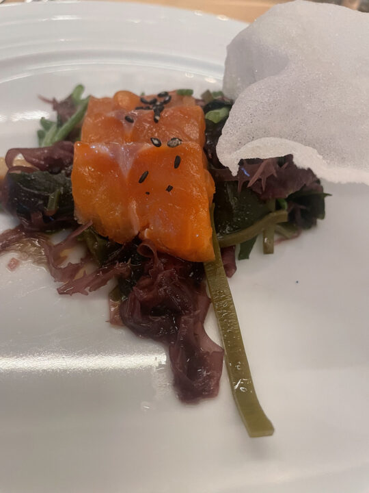 El menú comenzó con un Crudo de Steelhead Azero de Ensenada con limón preservado y aceite de pepita, maridado con un Sauvignon Blanc de Corona del Valle. Un inicio fresco y preciso que marcó la línea del resto de la noche.