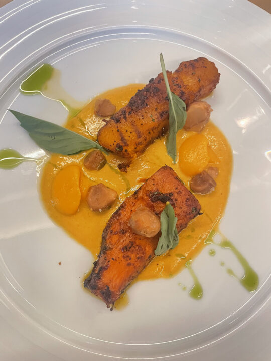 Le siguió una ensalada marina de Envero, luminosa y salina, acompañada por el Kuilly Sauvignon Blanc + Chardonnay de Las Nubes. Después, los sabores de la tierra tomaron protagonismo con una calabaza de castilla servida con horchata de calabaza, macadamia y salsa X.O, armonizada con un Chardonnay de Bajalupano.